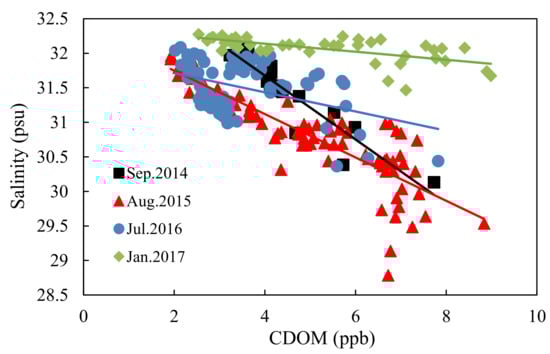 In contrast, salinity is a direct indicator of a freshwater plume; CDOM, like salinity, is also a soluble matter with distinct values in river and marine end-members [19]. In many river estuaries and plume systems, CDOM shows good negative correlations with salinity [21,24,54,55]. Therefore, in recent years, CDOM derived from the satellite ocean color data has been used to estimate salinities in coastal waters [10,19,20]. A simple negative linear relationship between CDOM and salinity was also observed in the current study. However, the relationships between CDOM and salinity have distinct local variable features among different freshwater and marine ecosystems and are influenced by regional hydrodynamic and biogeochemical processes [25]. Therefore, it is generally practical to apply a locally stable salinity–CDOM relationship to water areas of interest using sufficient regional field measurements, which then serve for documenting long-term salinity changes.