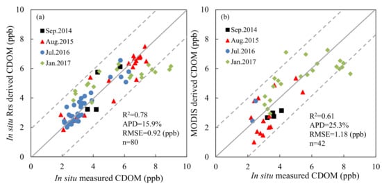 To evaluate the performance and test the robustness of our algorithm for the retrieval of CCDOM, we conducted a cross-validation [50,51]. In brief, one sample was selected from the full dataset and was used for the model validation. The remaining samples were then used to calibrate the model, and these calibrated models were adapted to derive CCDOM for the rest of the samples. This procedure was repeated until all of the samples of the full dataset were selected as the validation sample. The estimated CCDOM obtained from the above steps were independent from each other and formed a new validation dataset. Figure 4a compares the CDOM retrieved using the empirical algorithm with the measured values. As shown in Figure 4a, a strong linear relationship was found between the CDOM and ECO measured values, with an R2 value of 0.78, an APD value of 15.9%, and an RMSE value of 0.92 (ppb). The CDOM derived using the MODIS data roughly covaried with the in situ CDOM data. However, as shown in Figure 4b, the derived values of MODIS were somewhat smaller, and the deviation of these values as lower, with an R2 value of 0.61, an APD value of 25.3%, and an RMSE value of 1.18 (ppb).