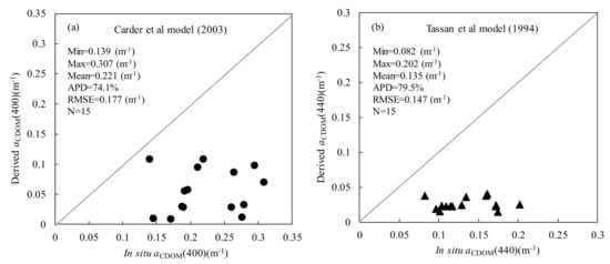 Validation of absorption coefficient of CDOM (aCDOM) estimated by using Carder et al.’s (2003) and Tassan et al.’s (1994) models, based on our in situ measured Rrs data.