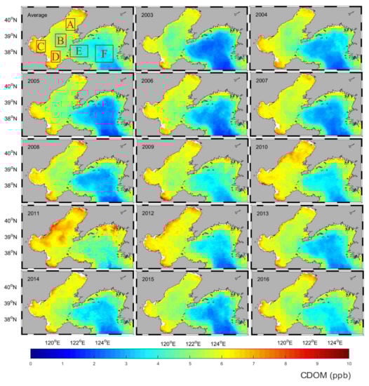 Annually averaged CDOM distributions derived from the MODISA monthly data (2003–2016). Note that the first subfigure shows the CDOM distribution averaged by the 14-year annual CDOM data. Red boxes refer to six subareas for the detailed description of the CDOM spatial and temporal distributions (A: the Liaodong Bay; B: the central of the Bohai Sea; C: the Bohai Bay; D: the Laizhou Bay; E: the Bohai Strait; F: the central of the North Yellow Sea).
