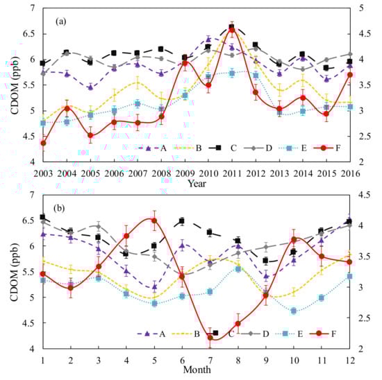 CDOM variations in six subareas derived from the MODISA data. (a) Annual CDOM averaged by the 12-month results of each year; (b) Monthly mean CDOM averaged among specific months over 14 years (2003–2016). A: the Liaodong Bay; B: the central of the Bohai Sea; C: the Bohai Bay; D: the Laizhou Bay; E: the Bohai Strait; F: the central North Yellow Sea. The Y-axis on the left represents the values of A, B, C, D, E, and the Y-axis on the right represents the values of F.