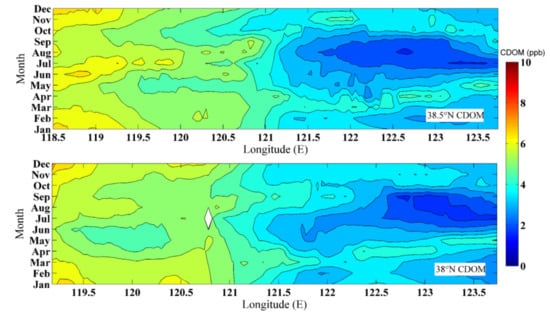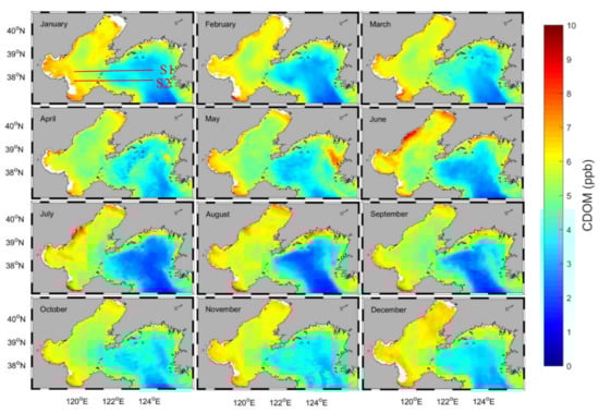 Along the 38.5°N latitude line (S1) (118.5–124°E), which covers the central BS to the east of the Bohai Strait, the CCDOM values were generally high in the west and decreased gradually to the east, with distinct seasonal variations (Figure 9). From March to May, high CDOM values extended to the central NYS. From September to December, the same trend could be observed. Similar to S1, along the 38°N latitude line (S2) (118–124°E), which covers the area from near the Yellow River bank to the east of the Bohai Strait, the 14-year average of monthly CDOM was high from fall to early spring and was low in summer. Over the entire year, a similar tendency was also observed, but the scale extent was low. As shown in Figure 9, along the 38.5°N and 38°N latitude lines, monthly CDOM varied from January to December.