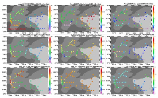 Distributions of in situ-measured salinity, CDOM and Chla values collected from three cruises (Aug. 2015, Jul. 2016, and Jan. 2017).
