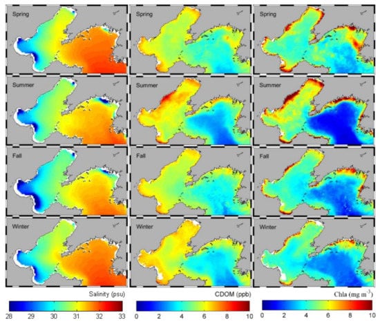 Distribution of eight-year (2009–2016) salinity averages for specific seasons obtained from HYCOM (HYbrid Coordinate Ocean Model) and the eight-year CDOM and Chla averages for specific seasons from MODISA. The HYCOM data is available from http://hycom.org/. Considering that the HYCOM data range is from September 2008 to the present, we focused on the period of 2009–2016. Detailed information about the HYCOM validation and parameter sets can be seen in [66,67] studies.