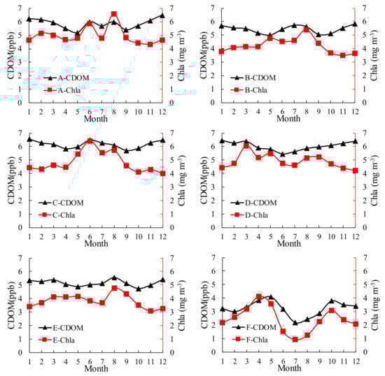 Monthly CDOM and Chla values decreased from the BS to NYS (Figure 9). In areas E and F, the CDOM and Chla values showed a similar variation tendency but had different seasonal variations. Correlations between Chla and CDOM were positive in these areas (Figure 12E,F). In areas A, B, C and D, Chla and CDOM exhibited a different variation tendency. Areas E and F are located far from rivers, as discussed above, and areas E and F are mostly influenced by phytoplankton; autochthons CDOM dominated in these areas. In contrast to central NYS, CDOM and Chla in areas A, B, C and D showed different variation tendencies (Figure 12). The fluctuations in CDOM were lower than in areas A and B, as there was a stable source of terrestrial CDOM. However, Chla had a distinct increase tendency during the spring and fall.
