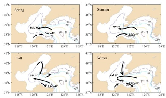 Distribution of two main water masses (i.e., Bohai Sea Central Water (BSCW) and Bohai Sea Coastal Water (BSCoW)) during the different seasons in our study area.