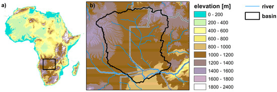 Location of the Upper Zambezi River Basin (UZRB) within the African continent with topographic data and stream networks at 15 arc sec spatial resolution from USGS HydroSHEDS (https://hydrosheds.cr.usgs.gov/data.php). (a) Digital elevation map of the African continent with box highlighting area in panel (b). (b) Digital elevation map of UZRB river basin with stream networks displayed. Gray lines indicate country borders.