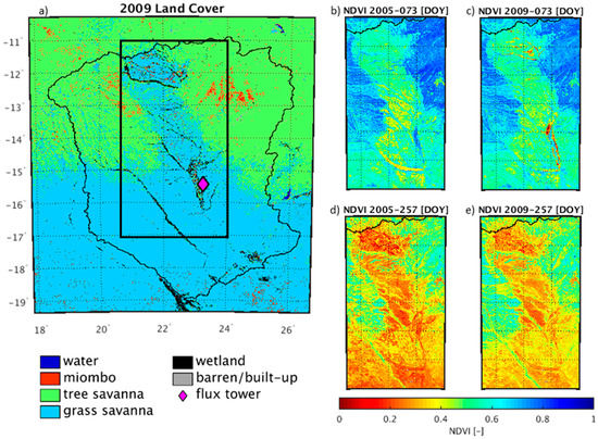 Maps of the UZRB study region. (a) Land cover for 2009 derived from MODIS MCD12Q1 and simplified to represent southern Africa. The black rectangle shows the outline of the inset panels on the right side of the figure. (b–e) The Normalized Difference Vegetation Index (NDVI) for a wet (b,c) and dry (d,e) period in 2005 and 2009 showing the variability in vegetation around the wetlands. NDVI was derived from the MODIS MCD43B4 data as described in Section 2.3.1. The ZM-Mon (Mongu, Zambia) CarboAfrica site location is displayed.