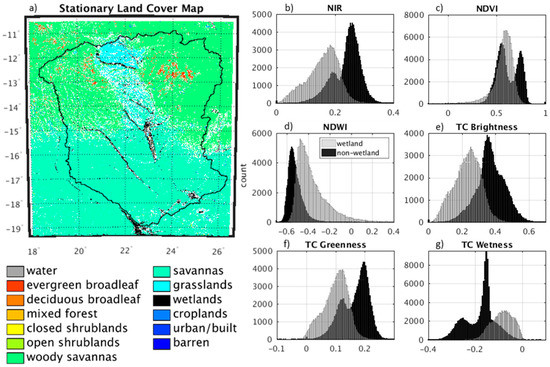 Stationary land cover map and histograms for unitless remote sensing indices using only the pixels representing wetland and non-wetland in the training data. Stationary land cover data and indices were derived from the MODIS MCD12Q1 and MCD43B4, respectively. (a) Stationary land cover map derived from MODIS MCD12Q1 data for 2010–2012. (b–g) Histograms for wetland and non-wetland pixels using NIR (b), NDVI (c), NDWI (d), TC Brightness (e), TC Greenness (f) and TC Wetness (g).