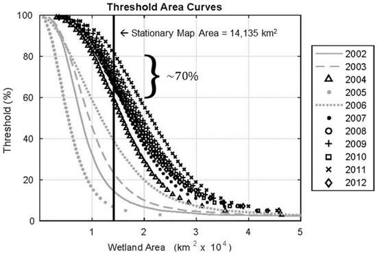 In order to compute wetland fractions at a given spatial scale, a threshold was determined to transform wetland probabilities into a binary signal for wetland presence. An area-threshold analysis was used to determine a cut-off probability above which we assume the 1 km pixel is completely covered by wetlands (Figure 4). Different probability thresholds were used to determine wetland presence at 1 km. We then calculated the area of the wetland extent over the entire UZRB basin at each threshold during the period of maximum wetland extent for a given year (around 9 April). The respective areas were compared to the wetland area determined by the stationary land cover map (Figure 3). Through this analysis, a threshold of 70% was determined to best represent the presence of wetlands; that is pixels with wetland probabilities ≥70% were assigned the value 1 and pixels with wetland probability <70% were assigned the value 0. Maps of wetland fractions were then created by averaging over 5 × 5 pixel windows. The resulting wetland maps are described in Section 3.1.