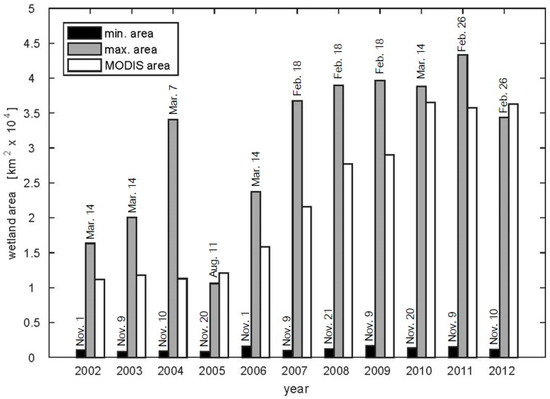 Bar graph showing the annual variability in wetland area. The minimum (black) and maximum (gray) wetland areas for each year are displayed alongside the wetland area from the annual MODIS MCD12Q1 product (white). The dates for the minimum and maximum areal extents are displayed above their respective bars.