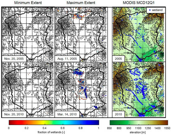 Maps of wetland fractions for the days of minimum and maximum wetland extent displayed alongside the corresponding MODIS MCD12Q1 static wetland land cover class in 2005 and 2010. Topographic contours are displayed as black lines at every 100 m between 650 m and 1550 m.