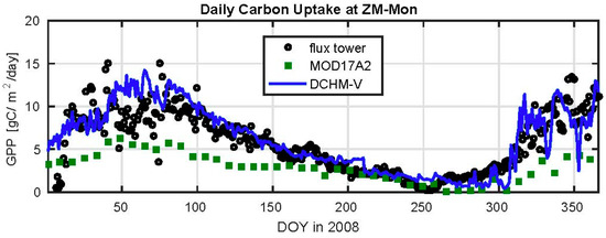 Time series of daily GPP in 2008 from MODIS MOD17A2 (square), CarboAfrica flux tower data (circle), and the DCHM-V estimates at the same location. Note the significant difference between MOD17A2 and the DCHM-V estimates. The location of the ZM-Mon tower within the UZRB is shown in Figure 2.
