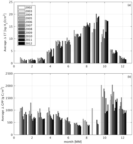 Bar plots of the monthly difference in ET (a) and GPP (b) for all wetland pixels over the study period 2002 to 2012. Δ = WET − DRY. Each bar is normalized by the area of wetlands present. Dry season differences in July correspond to about 50% of GPP at ZM-Mon. Note the inverse trends of ET and GPP in the wet–dry transition season (April–July) vis-à-vis the dry–wet transition (September–December).