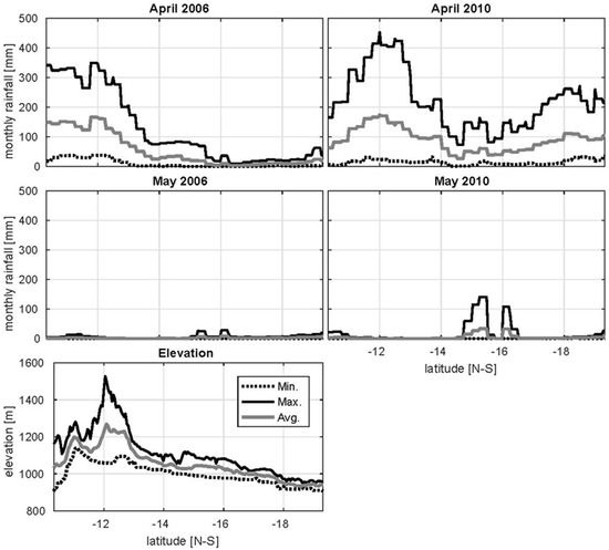 Minimum, maximum, and mean monthly rainfall accumulations along a transect within the UZRB for April and May in a wet year (2006) and a dry (2010) year. The minimum, maximum, and average elevations along the transect positioned between 22.7° and 24° longitude are displayed.