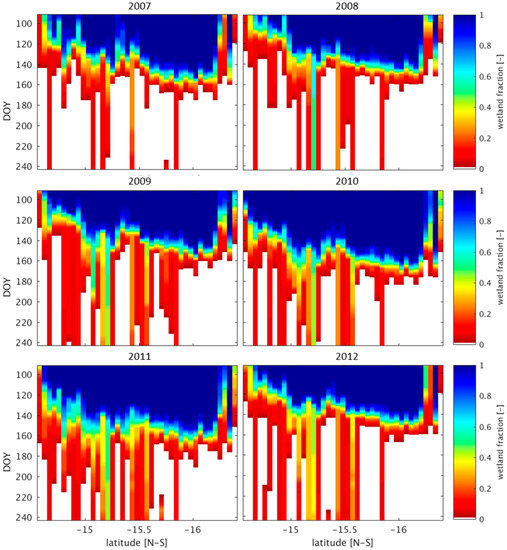 Wetland persistence in wet years. These plots show the maximum wetland fraction along a transect located between 22.7° and 24° longitude. The subset area is displayed in Figure S1. In years 2007–2012 many wetland areas continue to exist after the end of May (approximately day 150), specifically between −15° and −15.5° latitude. Hövemöeller diagrams of rainfall in wet years over the same region are presented in Figure S4.