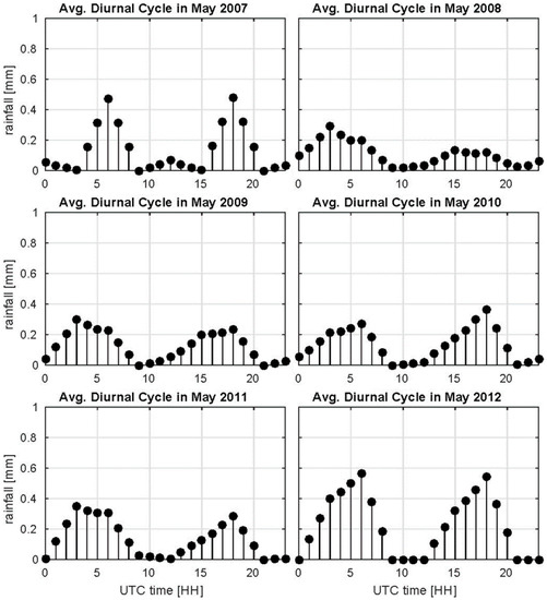 Average diurnal cycle of TRMM 3B42 rainfall accumulations for the month of May. The diurnal cycle is marked by a bi-model precipitation pattern with peaks in morning and evening. Only pixels within the midland area marked by Figure S1 with monthly rainfall totals greater than 25 mm/month were considered for this analysis.