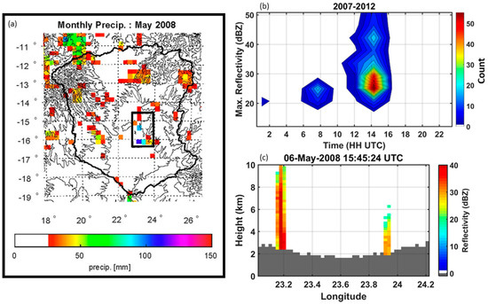 Left panel (a) Cumulative monthly rainfall in May 2008 from TRMM 3B42 rainfall product (~25 km resolution). Black box indicates area of interest for land–atmosphere interactions and is the same area shown in Figure S1. Top right panel (b) Climatology of the diurnal cycle of rainfall reflectivity from TRMM PR 2A25 product (~5 km resolution) for the month of May. High reflectivity indicates high rainfall rates (i.e., intense storms events). These events only occur between 2007 and 2012. Bottom right panel (c) TRMM PR 2A25 reflectivity profiles as examples of isolated deep (early in the transition season) and shallow (daily) isolated convection at around 5:45 p.m. LST on 6 May 2008. The terrain cross-section is marked in dark gray.