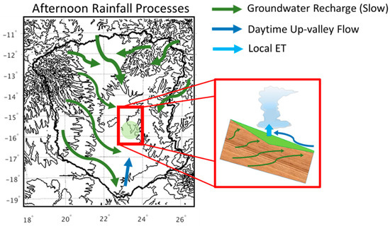 Previous work demonstrated that moisture delivered to the atmosphere via plant evapotranspiration contributes up to 60% of energy available for convection along the eastern slopes of the Andes [85], which results in a decrease in precipitation up to 50% along the Andean slopes. Over the low-lying areas of the Amazon basin, the change in precipitation is on the order of 75%, where evapotranspiration is the dominant source of moisture [85,86]. Similarly, in a study on precipitation recycling in west Africa local evaporation served as the moisture source for 27% of local precipitation [87]. Figure 14 shows a conceptual illustration of the conditions favorable to develop land–atmosphere interactions in the UZRB consistent with observations. First, initial conditions that allow for regional wetland expansion are set by wet season precipitation linked to large scale forcing mostly at higher elevations in the AHP. Infiltration and groundwater recharge occur, followed by lateral redistribution by subsurface flows and discharge along the mid-basin low lying convergence areas. Second, rainfall recycling in the transition season (April–June) driven by up-valley daytime flows converging to the mid-basin region enhance cumulus convection locally, leveraging moist energy available from surface fluxes. Rainfall suppression in the dry season proper (July–September) reflect colder temperatures and depressed dew points with regard to morning fog, and the collapse of land–atmosphere interactions due to weakening of regional circulations, increased stability and reduced moisture supply. Thus, reductions in wetland extent in the UZRB limit the timing and amount of evapotranspiration and water vapor content in the lower troposphere, and in turn may impact low level stability and thus rainfall. The spatial and temporal scales over which this feedback between wetland persistence and local convective storms should be further investigated using a coupled land–atmosphere model.