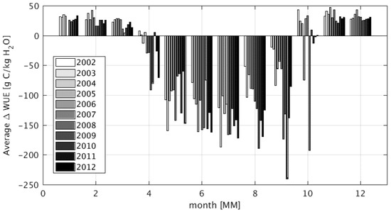 Bar plots of the monthly difference in water use efficiency (WUE) for all wetland pixels over the study period 2002 to 2012. Δ = WET − DRY. Each bar is normalized by the area of wetlands present. Note that area of wetlands disappear at lower elevations in dry years, and thus the more efficient water use later in the dry season reflects the small areas of wetlands at higher elevations, colder temperatures, and where subsurface flow is the source of moisture. The water-use overhead of productivity increases nonlinearly through the dry season.