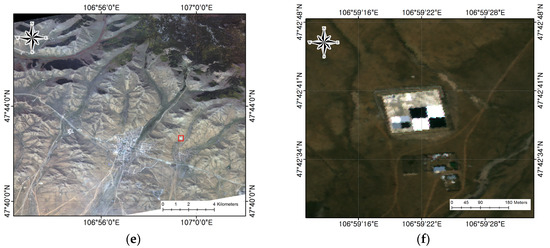 (a,c,e) KOMPSAT-3 and -3A RGB images of Goheung County, South Korea acquired on 14 May 2017, Naju, South Korea acquired on 27 July 2017, and Zuunmod, Mongolia, acquired on 19 September 2017, respectively. (b,d,f) cropped satellite RGB images showing the locations of the deployed four radiometric tarps corresponding to red squares in (a,c,e) respectively.