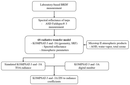 Flowchart showing the vicarious radiometric calibration of KOMPSAT-3 and -3A using the 6S radiative transfer model and related input parameters.