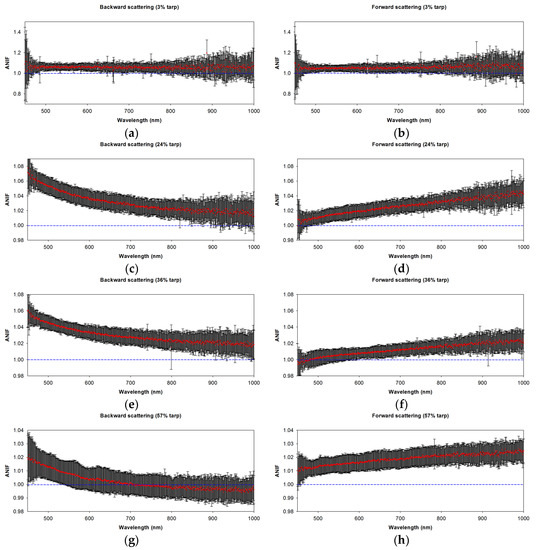 Figure 4 presents the measured ANIF values of the four tarps according to KOMPSAT-3 geometry, which is the first case in Table 2. The geometry conditions of the laboratory BRDF measurement include an incident angle of 28.500° and a detection angle of 17.202°. According to Table 2, forward not backward scattering of the reflectance radiance is expected, because the relative azimuth angle between the sun and the sensor is 102.4°. Figure 4a,c,e,g shows backward scattering and Figure 4b,d,f,h shows forward scattering geometry. The measured ANIF values according to wavelength spectral bands are shown as red points, the uncertainty of the BRDF measurement is represented by the vertical error bar, and the blue dashed line signifies that no BRDF effect is expected due to an ANIF value of 1. Under forward scattering conditions, the ANIF values from laboratory-based BRDF measurements depend on the spectral wavelength (Figure 4). ANIF values from laboratory-based BRDF measurements were then used to normalize tiled KOMPSAT-3 geometry to the nadir direction for the first case in Table 2.