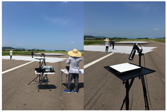 Reflectance values of four reference tarps, including wavelength spectral ranges (350–950 nm) of KOMPSAT-3 and -3A, were obtained using the ASD FieldSpec® 3 hyperspectral radiometer (Figure 5). This radiometer has been widely used for vicarious calibration of satellite imaging sensors because it is reliable and can measure a broad spectral range between 350 nm and 2500 nm [41,42,43]. The full width at half maximum (FWHM) of the radiometer is 3 nm in the range 350–700 nm and 10 nm from 700–2500 nm. Sampling spectral intervals are 1.4 nm (350–1000 nm) and 2 nm (100–2500 nm), respectively. The primary field of view for the optical fiber to measure the reflected radiance is 25° at a height of 1.5 m.