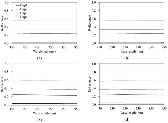 The spectral reflectances of the reference tarps were measured with ten repetitions for each point and 10 points for each tarp to ensure accuracy of the reflectance through repetition. The measured hyperspectral reflectance curves for all tarps and dates in this study showed almost flat patterns for the spectral band range of the KOMPSAT 3 and -3A (Figure 6). The mean reflectances of the four tarps were 3%, 24%, 36%, and 57%, respectively. The tarps were homogeneous within 1% spatial variations of ±0.1%, ±0.3%, ±0.4%, and ±0.8%, respectively. The spectral band reflectances of the tarps required for the radiometric calibration were calculated by applying the SRF curve of the two satellites (Figure 7).