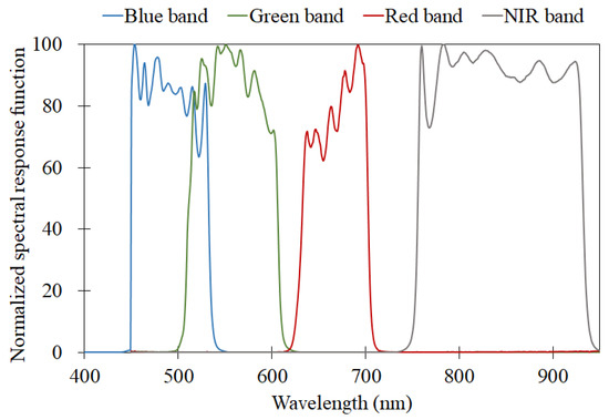 Relative spectral response function (SRF) for the blue, green, red, and near-infrared (NIR) spectral ranges of KOMPSAT-3 and -3A.