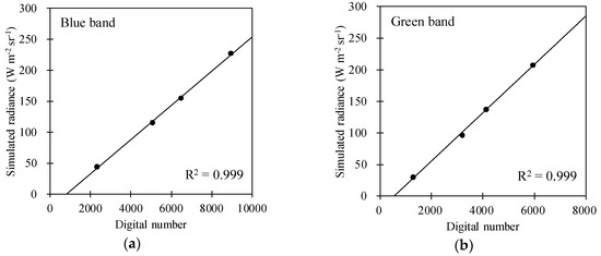 In the case of KOMPSAT-3A, although only one scale factor was estimated, despite several field observations, the geometric and atmospheric conditions in Table 2 and Table 3 are valid for determining DN to satellite radiance coefficients. The viewing zenith angle of KOMPSAT-3A acquired on 19 September 2017 is 3.112°, meaning that a negligible BRDF effect is expected because the geometric difference between ASD and KOMPSAT-3A is less than 5°. Figure 9 shows the scatterplots between KOMPSAT-3A DN and TOA radiance from the 6S radiative transfer model for four multispectral bands. The scatter plots of TOA radiance calculated from four distinctive radiometric tarps and the KOMPSAT-3A DN values are closely located along the lines of linear regression in each spectral band. Additionally, the coefficient of determination (R2) values all exceed 0.999, indicating that the suggested methods are suitable for determining DN to radiance coefficients.