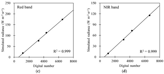 Scatterplots between KOMPSAT-3 DN and simulated TOA radiance fine all multispectral bands acquired on 20 September 2017; (a–d) represent the blue, green, red, and NIR bands, respectively.