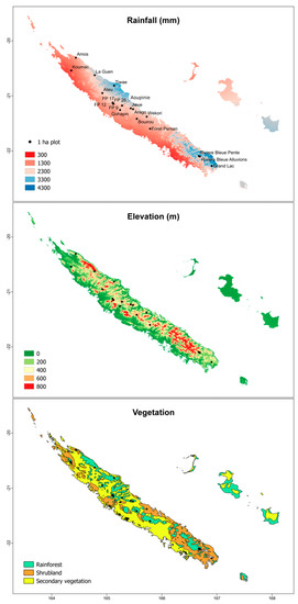 The landscape is a mosaic composed of secondary vegetation (c. 50%), low- to mid-elevation shrublands or ‘maquis’ found on ultramafic substrates (c. 25%), another quarter of low- to mid-elevation rainforests, 1% of montane rain forests and shrublands found above 800 m, with a few relictual patches of dry sclerophyll forests scattered along the west coast [21,22]. This variety of environments along with a complex biogeographical history is hypothesized to be the main determinant of the exceptional biological diversity of the hotspot that contains 3371 vascular plant species with an endemism rate of 75% [23]. This study focused on low- to mid-elevation and montane rainforests, which together account for 63% of the flora with an endemism rate of 83% [23].