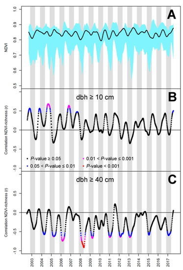 Temporal variation of MODIS NDVI in 19 one-hectare plots in New Caledonia (A) and in its ability to predict species richness of trees with a diameter at breast height (dbh) above 10 cm (B) and 40 cm (C). (A) The black line represents the mean and the blue shaded area the interval within which plot values are found; (B,C) The color set refers to four significance levels of correlation tests. (A,C) The gray shaded area indicates the months of November to April (usual wet season).