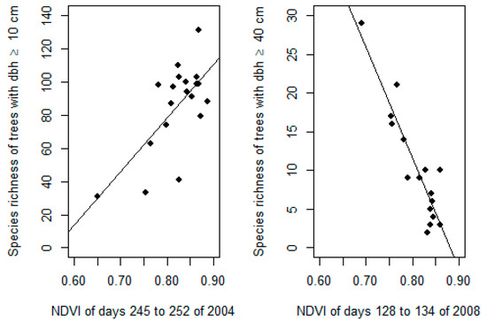 The same screening approach based on EVI did not performed better than that based on NDVI (Figure A1). The best prediction of species richness was taken from days 254 to 260 of 2002 (i.e., also at the end of the dry season) for trees of dbh ≥ 10 cm and explained 39% of the variance (|r| = 0.62; p < 0.01) and taken from days 51 to 57 of 2008 (at the end of the wet season this time) for trees of dbh ≥ 40 cm and explained 59% of the variance (|r| = 0.77; p < 0.001). This approach was also found to provide better predictions of tree species richness than overall, seasonal, annual and monthly statistics based on EVI (Table A1).