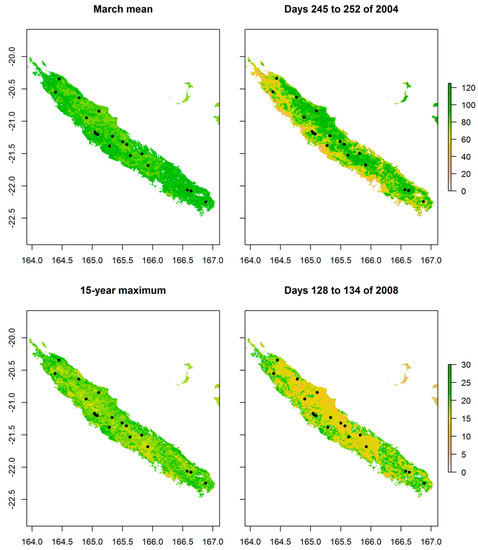 Certain monthly statistics (e.g., wet season means) appeared to be significantly correlated with the species richness of large trees in New Caledonia (maximum |r| = 0.78; minimum p < 0.001) but not with the overall tree species richness (|r| < 0.39; p > 0.05) (Table 2). The overall tree species richness was better predicted by the overall and dry season maxima but the correlation remained relatively low (|r| = 0.52 and 0.51, respectively; p < 0.05). Based on the proposed screening approach, the single scene offering the best prediction of the overall tree species richness was taken from days 245 to 252 of 2004 (i.e., at the end of the dry season) and explained 47% of the variance (|r| = 0.68; p < 0.01). The scene offering the best prediction of the large tree species richness was taken from days 128 to 134 of 2008 (at the beginning of the dry season) and explained 83% of the variance (|r| = 0.91; p < 0.001) (Figure 2). The former increased (species richness of trees with dbh ≥ 10 cm = 324 * NDVI − 181) while the latter decreased as NDVI increased (species richness of trees with dbh ≥ 40 cm = −143 * NDVI + 126) (Figure 3 and Figure 4).