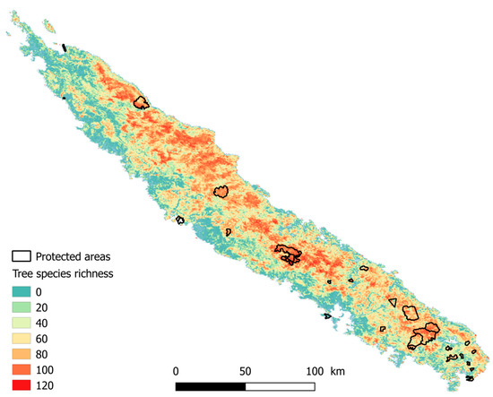 Species richness of trees with dbh ≥ 10 cm predicted from a single carefully selected scene (days 245 to 252 of 2004) and the protected area network in New Caledonia.