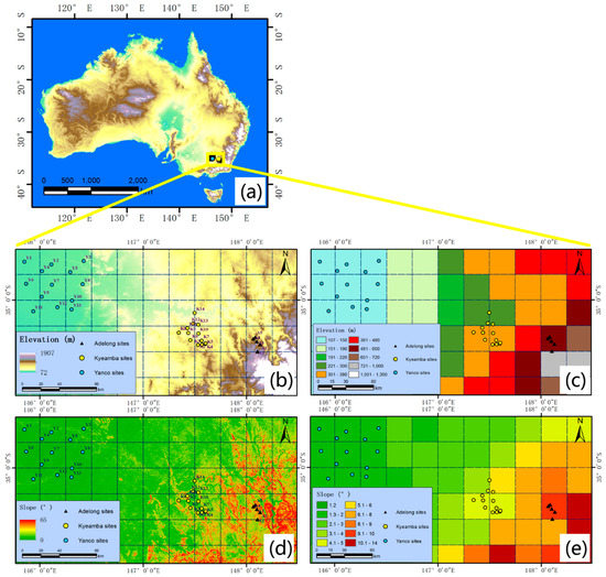 Locations and terrain of the Murrumbidgee Soil Moisture Monitoring Network (the dashed line presents the pixel size of 0.25° × 0.25°): (a) position of the network in Australia, (b) elevation derived from SRTM DEM of 30 m spatial resolution, (c) average elevation for each grid of 0.25° × 0.25°, (d) terrain slope derived from SRTM DEM of 30 m spatial resolution, (e) average terrain slope for each grid of 0.25° × 0.25°.