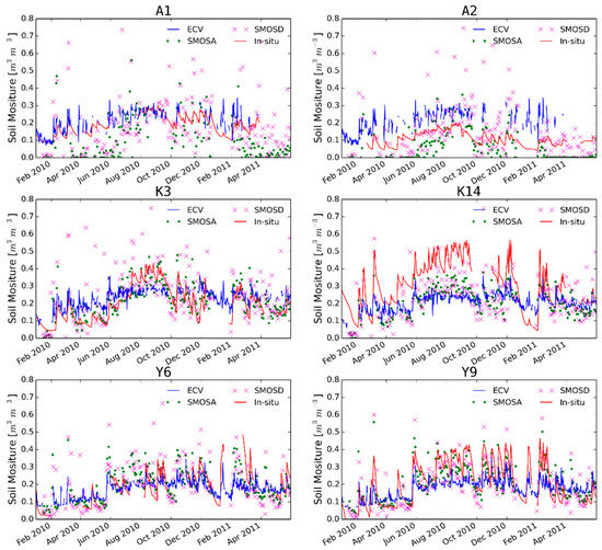 To compare the performance of the three satellite-based soil moisture products, we firstly evaluated them at six selected sites (A1, A2, K3, K14, Y6, and Y9), which were randomly selected from two sites within each network. The error metrics at the selected sites are shown in Table 2. The metrics show that at the Adelong sites the ECV product outperformed both SMOS products, with higher R values, lower MAEs, RMSEs, and bias. Similarly, the Rano values at A1 and A2 are higher for the ECV product than those of either SMOS products, whereas the RMSE and ubRMSD for the soil moisture anomalies are lower for the ECV product than those of the SMOS products.