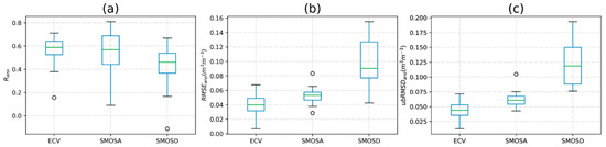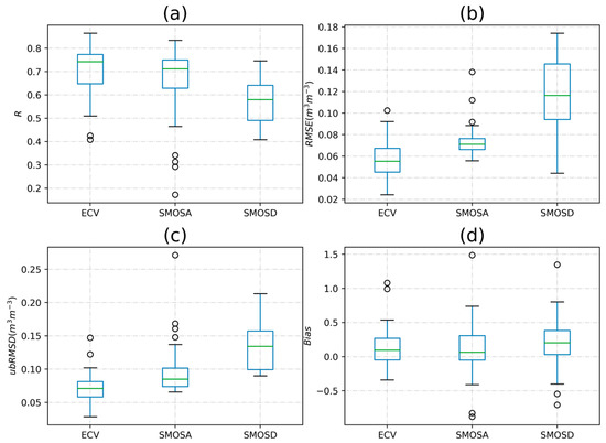 As the suitability of the selected sites is difficult to evaluate, the error metrics at each site were then calculated to further evaluate the performance of the different soil moisture products at the site-scale. The error metrics plotted as box plots are shown in Figure 3; further, the boxplots of Rano, RMSEano, and ubRMSDano are shown in Figure 4. Figure 3 shows that the ECV products at each site generally have higher R values, and smaller values of RMSE, ubRMSD, and bias than the SMOS products. In addition, the bias values at most sites are positive, implying that the soil moisture products overestimate the in situ measurements. Furthermore, the SMOSA product shows better error metrics than SMOSD, with higher R values, and smaller RMSE and ubRMSD.