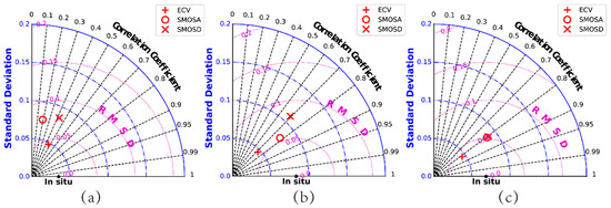 Taylor diagrams displaying correlation coefficients, standard deviations, and root mean standard deviations between three soil moisture products and in situ soil moisture over three networks: (a) Adelong; (b) Kyeamba; and (c) Yanco.