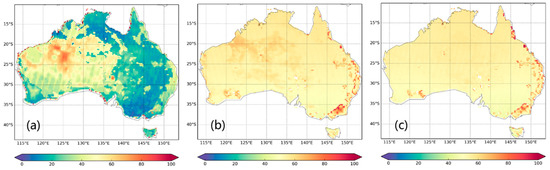 Percentage of data gaps of (a) ECV; (b) SMOSA; and (c) SMOSD soil moisture products from 1 January 2011 to 31 December 2012 over Australia.