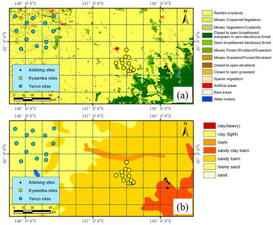 Validation results reveal that the ECV and SMOS soil moisture products at Yanco are closer to the in situ measurements than those at Adelong and Kyeamba, and the worst performance can be found in Adelong. Figure 8 displays the soil texture, and land cover types within the study area, where significant differences in landscapes occur between the three network locations. According to Leroux et al., the forest fraction has a great impact on SMOS errors in Australia, especially near the coasts where forest occurs [38]. Table 1 and Figure 8 show that the Kyeamba network is located in an area of gentle slopes with mixed grassland and cropland, the Yanco network is located in a plain with mixed grassland and cropland. The metadata of the OzNet sites did not include land cover and soil texture information, which is shown in Figure 8. The land cover map was derived from the GlobCover 2009 obtained from the European Space Agency (ESA) GlobCover project [40], and the soil texture map was derived from the Harmonized World Soil Database (HWSD) v1.2 [41]. The forest fraction of the satellite pixel where the Adelong sites are located is about 40%, according to Figure 8a, which shows that the vegetation cover at the five Adelong sites are grassland and cropland. This demonstrates that representing the soil moisture of the pixel with the Adelong sites may be problematic. The soil texture map shows that the Yanco and Kyeamba network locations generally have homogenous soil types of loamy sand and sandy loam, respectively. The soils at the Adelong network are mixed with sandy loam and sandy clay loam, with the sand percentage in the soil decreasing from west to east. The percentage of sand, as was pointed by Leroux et al., has a negative influence on SMOS product error for Australia [38]. The SMOS products have a high dry bias at the Adelong sites, which is possibly due to the influence of the vegetation types being greater than that of soil texture in the study area.