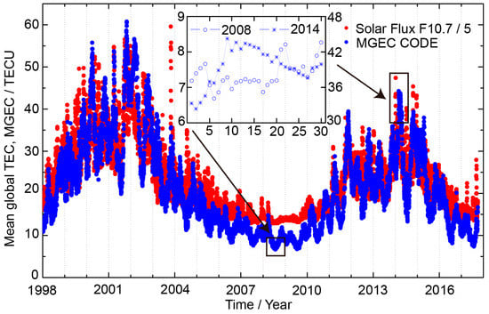 The mean global total electron content (TEC) evolution (blue) derived from the Center for Orbit Determination in Europe (CODE) Global Ionosphere Maps (GIMs) versus the solar flux F10.7 index (red) from 1998 to 2016. Two datasets were selected indicating the low (2008) and high (2014) solar activity periods. MGEC—mean global TEC; TECU—TEC unit.