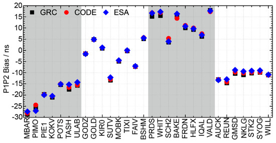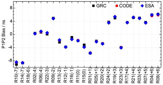 The mean bias and STD of the GLONASS satellite P1-P2 DCB estimates for Doy 050–079 in 2014, are shown in Figure 13. The difference in the GRC-CODE bias and GRC-ESA bias was very small for most satellites, except for the R04(+6) and R08(+6). This implied that the GLONASS satellite DCBs that were estimated at the GRC, were systematically biased when compared with the CODE and ESA. The reason for this was also believed to be related to the different tracking network and employed receivers [43]. Compared with the GPS, both the GLONASS bias and STD were larger for the GRC–CODE and GRC–ESA. The biases ranged from −0.7 to 0.7 ns, and the RMSs ranged from 0.08 to 0.68 ns in 2014. The mean STDs and RMSs are also presented in Table 2.