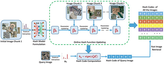 Our proposed hashing approach contains two main steps: (1) hash model formulation, which defines the form of hash model used in the paper; and (2) online hash function learning, which describes how to update the hash functions dynamically based on the sequentially arriving data. The illustration of the proposed online hashing approach for scalable RS image retrieval is shown in Figure 1.