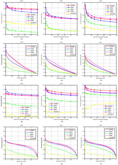 The average precision with respect to different retrieved samples and the precision-recall curves of compared hashing methods on the two datasets are shown in Figure 3. Since too many cures will be overlapped and hard to distinguish, we only keep the online hashing methods and the batch-based RS hashing methods in the figure. In Figure 3a–c,g–i, we can observe that our OPRH method consistently outperforms OSH and OKH methods when the retrieved images increase and the improvements are more notable for long code length. The reason may be that OSH and OKH have large quantization error when generating binary codes while our OPRH can reduce the error in code binarization through the backward decoder learning procedure. Precision–recall curve reflects the overall image retrieval performance of different hashing approaches. In Figure 3d–f,j–l, we also find that our OPRH method achieves the best results among the compared online hashing methods. The proposed OPRH method has comparable overall performance to batch-based PRH method and much better than KULSH approach on the two datasets.