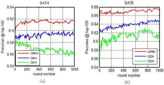 Two public large-scale satellite datasets are used in the experiments, i.e., SAT-4 and SAT-6 airborne datasets [39], which contain 500,000 and 405,000 images, respectively. SAT-4 dataset contains four classes and SAT-6 contains six classes. All the images in these two datasets are normalized to pixels in size. Some example images from the two datasets are shown in Figure 2. One thousand images are randomly selected from each dataset as testing queries and the remaining images are used for training and retrieval database. We extract a 512-dimensional GIST descriptor [40] for each image as visual feature representation. Given an input image, a GIST descriptor is computed as follows: (a) convolve the image with 32 Gabor filters at 4 scales and 8 orientations, producing 32 feature maps of the same size of the input image; (b) divide each feature map into 16 regions (by a 4 × 4 grid), and then average the feature values within each region; and (c) concatenate the 16 averaged values of all 32 feature maps, resulting in a -dimensional GIST descriptor. GIST summarizes the gradient information (scales and orientations) for different parts of an image, which provides a rough description of the scene.