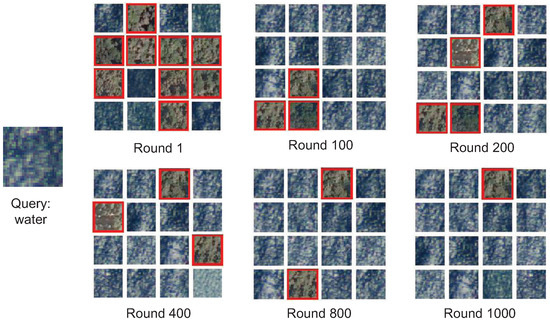Visualized retrieval example after different rounds by our OPRH method on SAT-6 dataset with 64-bits. Top-16 returned image patches for the query are shown for each round and the false positives are annotated with a red rectangle.