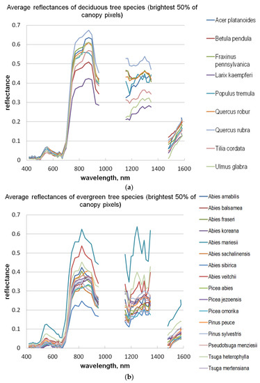 37]. These sensors provide the ability to capture very high spatial resolution HS images with GSDs of 10 cm and even less and to carry out 3D data analysis, thus giving very detailed spectral information about tree canopies. Since UAVs are usually small in size, their sensor load and the flying range are somewhat limited, which makes their use less feasible in typical operational forest inventory areas.